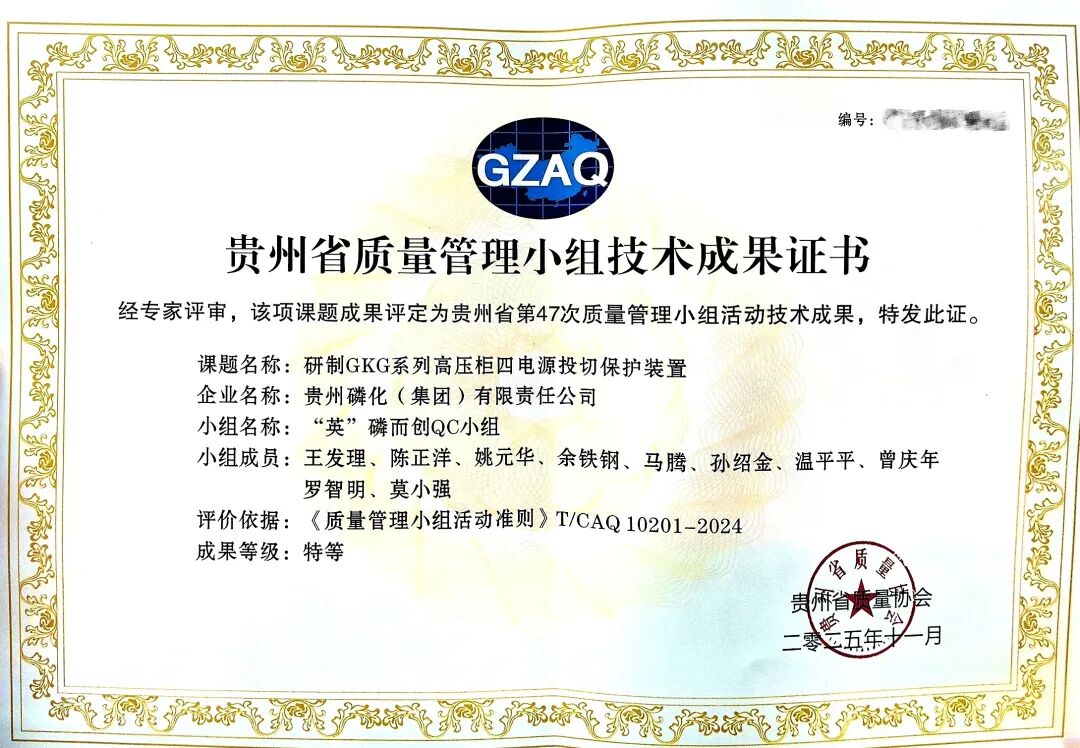 Recently, news came from the Guizhou Provincial Quality Management Association that the project Development of GKG Series High-Voltage Cabinet Four-Power Switching and Protection Device undertaken by the QC Team of Yingping Mine, Wengfu Phosphate Mine, stood out in the provincial quality management achievement evaluation and won the special-class achievement recognition. This achievement provides a new technical solution for the power supply safety of underground mines.
